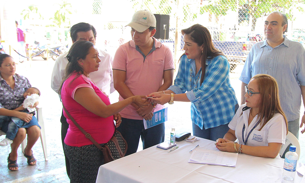 La viceministra de Comercio e Industria, Merlin Barrera, y el alcalde de Nejapa, Adolfo Barrios, presidieron la entrega de más Tarjetas Solidarias del Subsidio al Gas, acto realizado en el parque central del municipio.