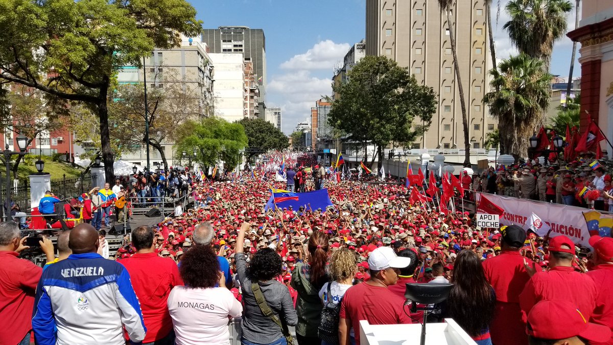 En una multitudinaria marcha, el pueblo bolivariano de Venezuela avanza por las calles del centro capitalino con banderas y pancartas en contra de la injerencia estadounidense hasta el Palacio de Miraflores (sede del Ejecutivo), para brindar apoyo al Gobierno de Nicolás Maduro.