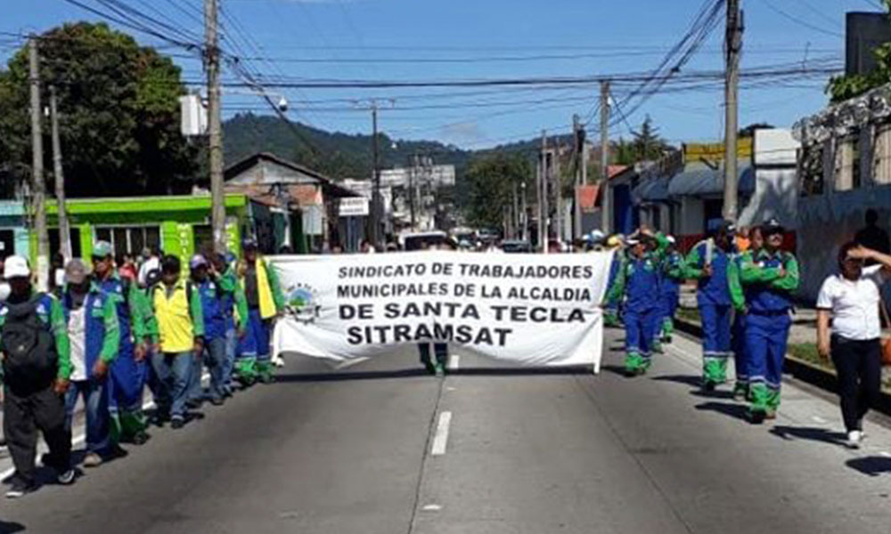 154 trabajadores despedidos de la alcaldía de Santa Tecla, marchan hacia las instalaciones de la comuna, exigiendo su reinstalo laboral.
